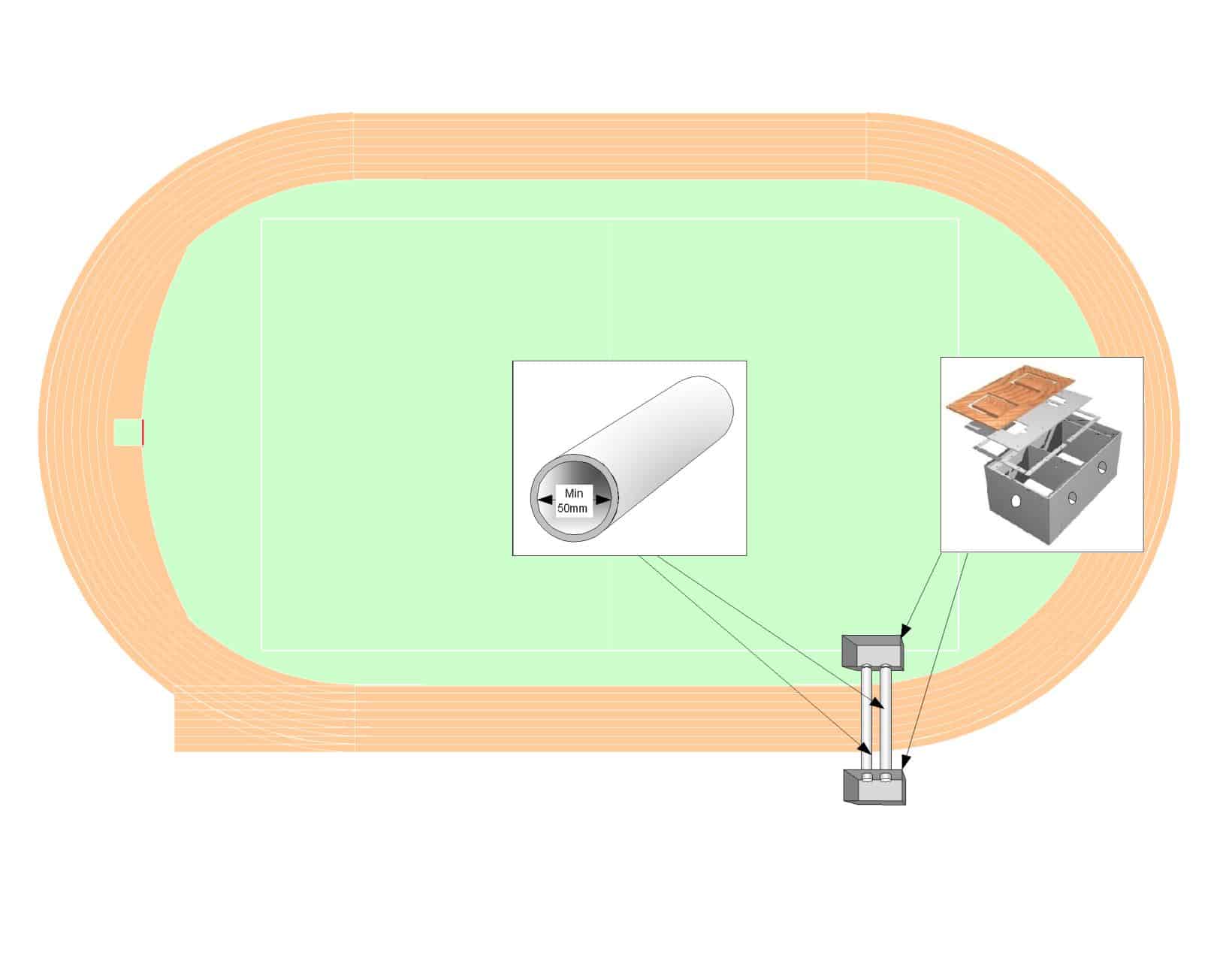 - Conduits running from finish line to 100m, 200m, and 1500m start positions