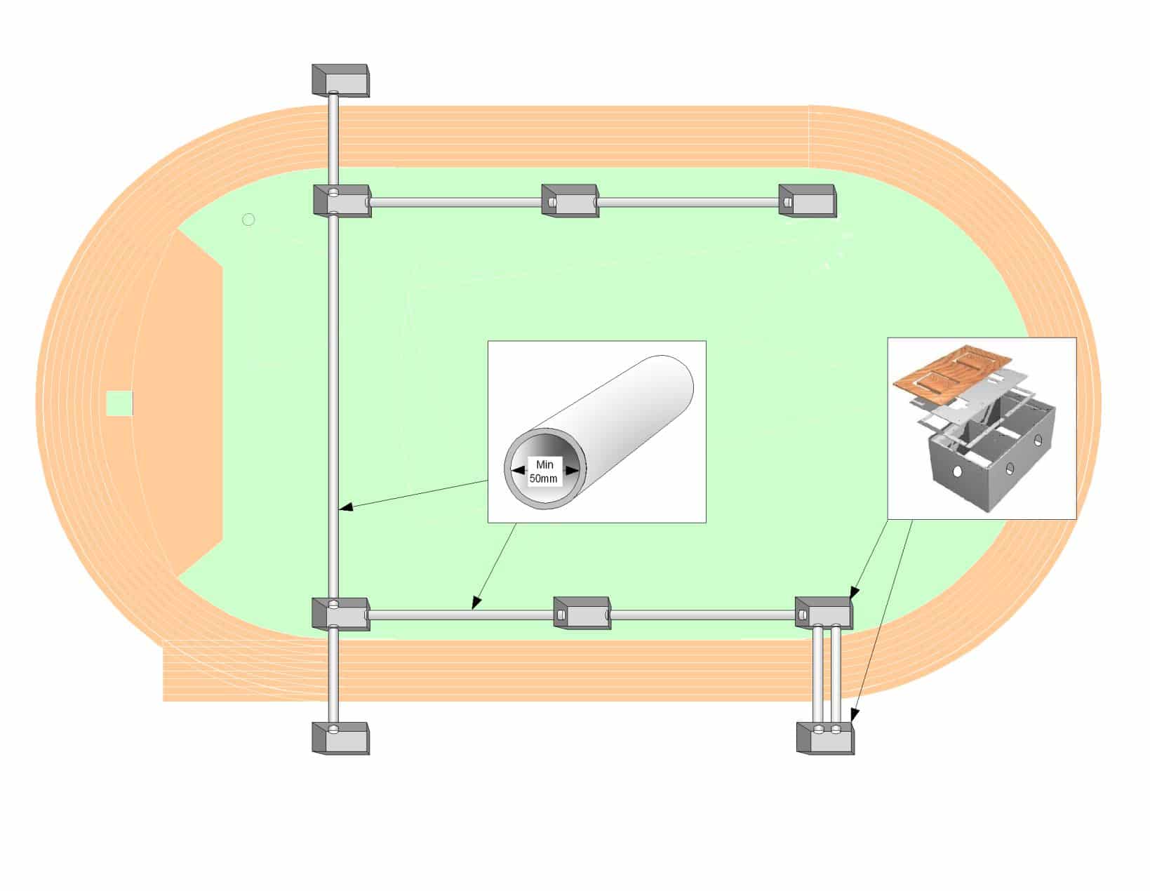 Underground conduits are essential for running wires throughout the venue to support timing cameras and accessories. Recommended 2³ min. width & 45:° or 90:° elbows.